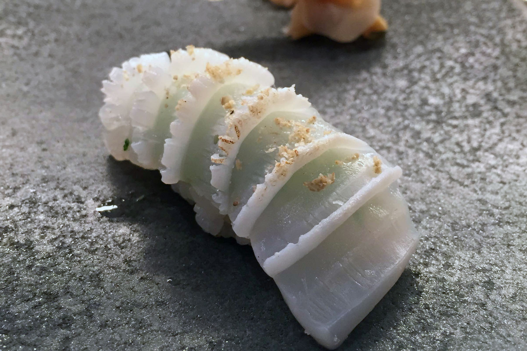 Moving into our first taste of fish with Momotaro's signature Aju Yakisugi which is cured Jack Mackerel smoked with 1000 year-old cypress, which seems really old, even for a tree.