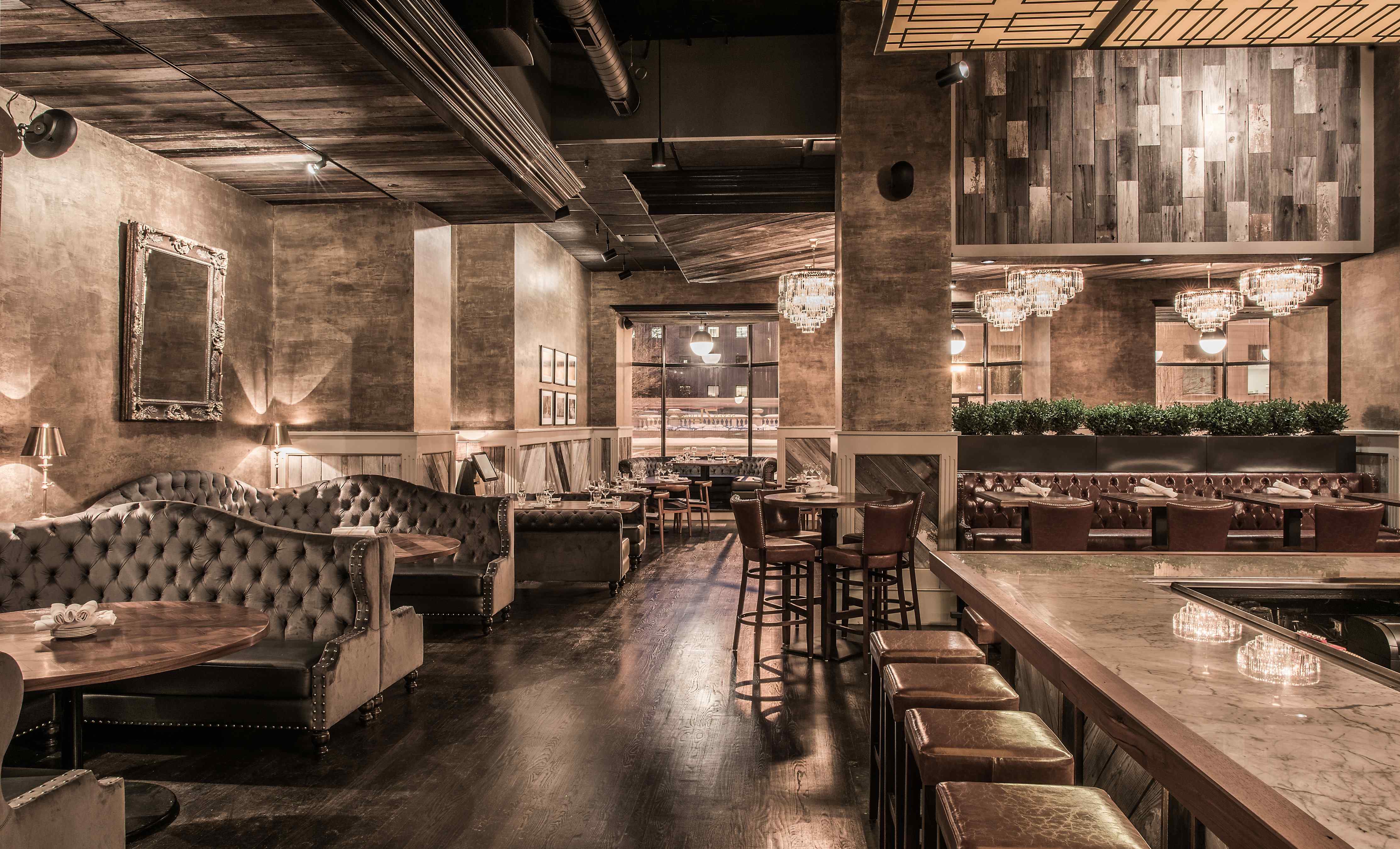 Seven Lions' huge and versatile dining room offers the perfect space for any occasion. Large booths provide cozy, intimate areas, while the bar is open and spacious. Beautiful wood accents and plush fabrics lend a warm and luxurious feel to the restaurant. You're sure to feel comfortable, whether you're just grabbing a beer or settling in for a full meal.