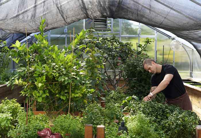 Eventually my dad and I put a roof over the first iteration of the greenhouse to extend it through the winters with a true agricultural-style house featuring a double-celled polycarbonate, allowing us to really do some cool things. For me, I would be a horrible salesperson if I didn't have that personal physical connection with what I'm doing and and likewise, I would like for my cooks to experience that same thing. From taking care of seed properly, harvesting, storage, planning, planting, to using every part of that plant as it grows and troubleshooting if issues come along. There's a lot of connection from beginning to end to what we're serving guests. It might be something as simple as some anise hyssop greens that is a super punchy herb and maybe something that somebody's never tasted before. We're not a super fancy three-Michelin-star restaurant but we utilize the same types of ingredients that they do in these places and probably at a fresher level considering they're coming from our garden that day. It makes something that we have very special and it keeps me in tune and connected and wanting to continue to do this stuff because it’s not easy work.