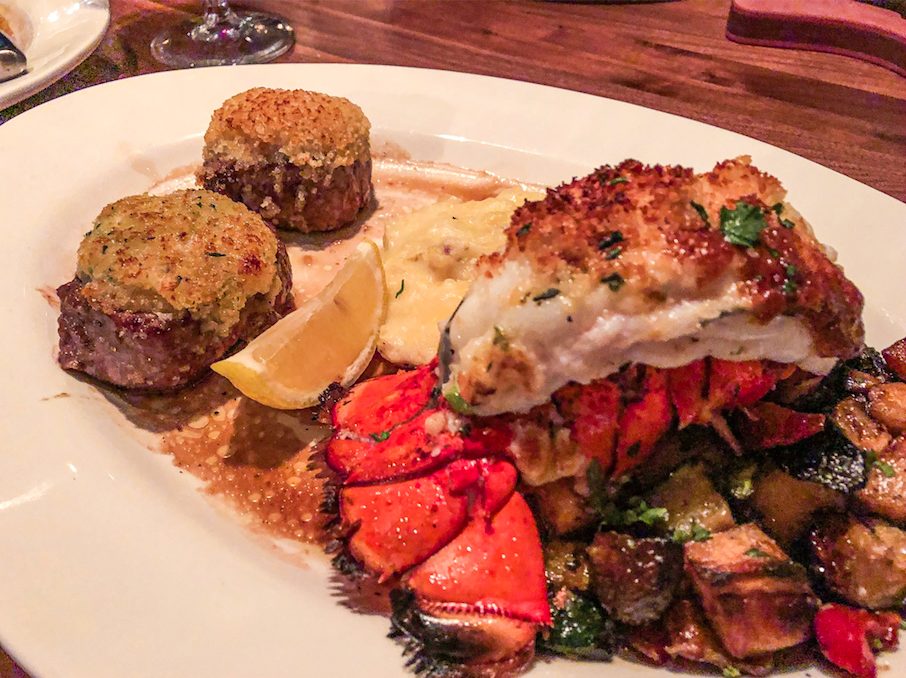 Get the best of both worlds in the dinner only Filet Medallions and Parmesan-Crusted Lobster Tail ($36.99). A pair of horseradish and parmesan-crusted filets melt in the mouth while a buttery lobster tail awaits, sandwiched between roasted root veggies and a generous ladling of mashed potatoes. The menu does not list a specific wine pairing but the staff expertly complemented the dish with a balanced Pinot Noir.