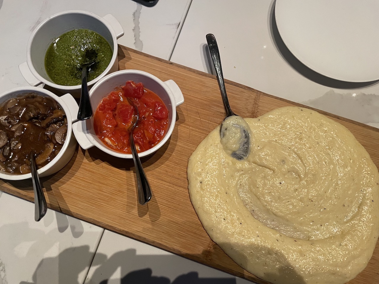 You’ll be missing out if you don’t order the shareable Polenta Board, an almost sensual tableside presentation with accoutrements like sauteed mushrooms, roasted tomatoes or housemade pesto, all based on the chef’s whim of the day.