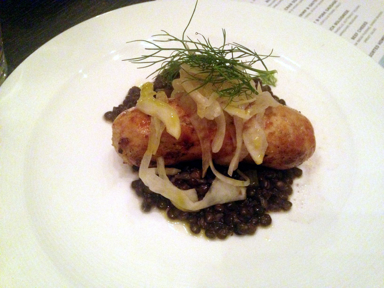 Tangy fennel kraut is a fantastic complement to the rich rabbit and pork sausage.