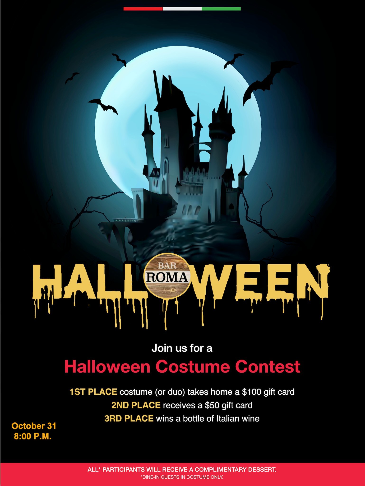 Bar Roma, the Roman-inspired eatery located in Andersonville, will offer a Halloween celebration on Thursday, October 31. A costume contest will take place at 8 p.m., with dressed guests competing for three top prizes. The person (or duo) with the best costume will win dinner for two ($100 gift card); second place will receive a $50 gift card; and third place will be awarded a bottle of Italian wine. All dining guests that arrive in costume throughout the evening will receive a complimentary chef's choice dessert.