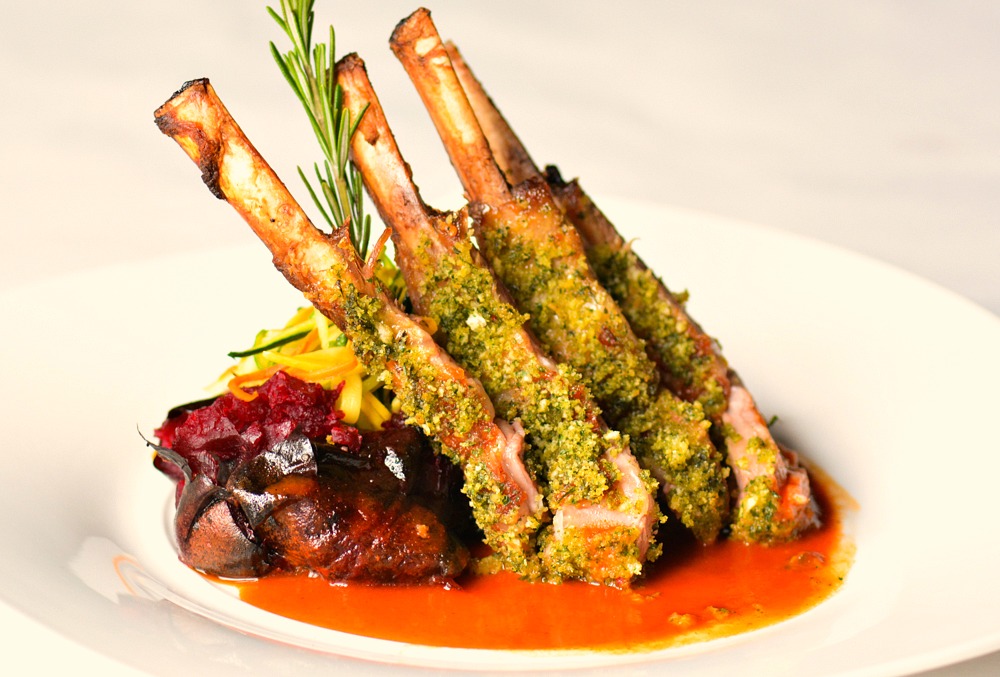 Cordero -- breaded lamb chops, smashed beets and sweet potatoes, mint juice.