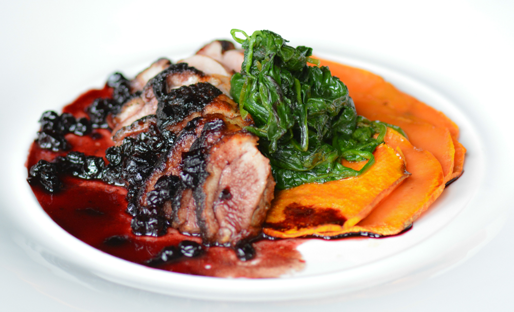 Enjoy entress like Perl de Nigro -- Duck breast, sweet potato gallette, Swiss chard, black currant-port reduction