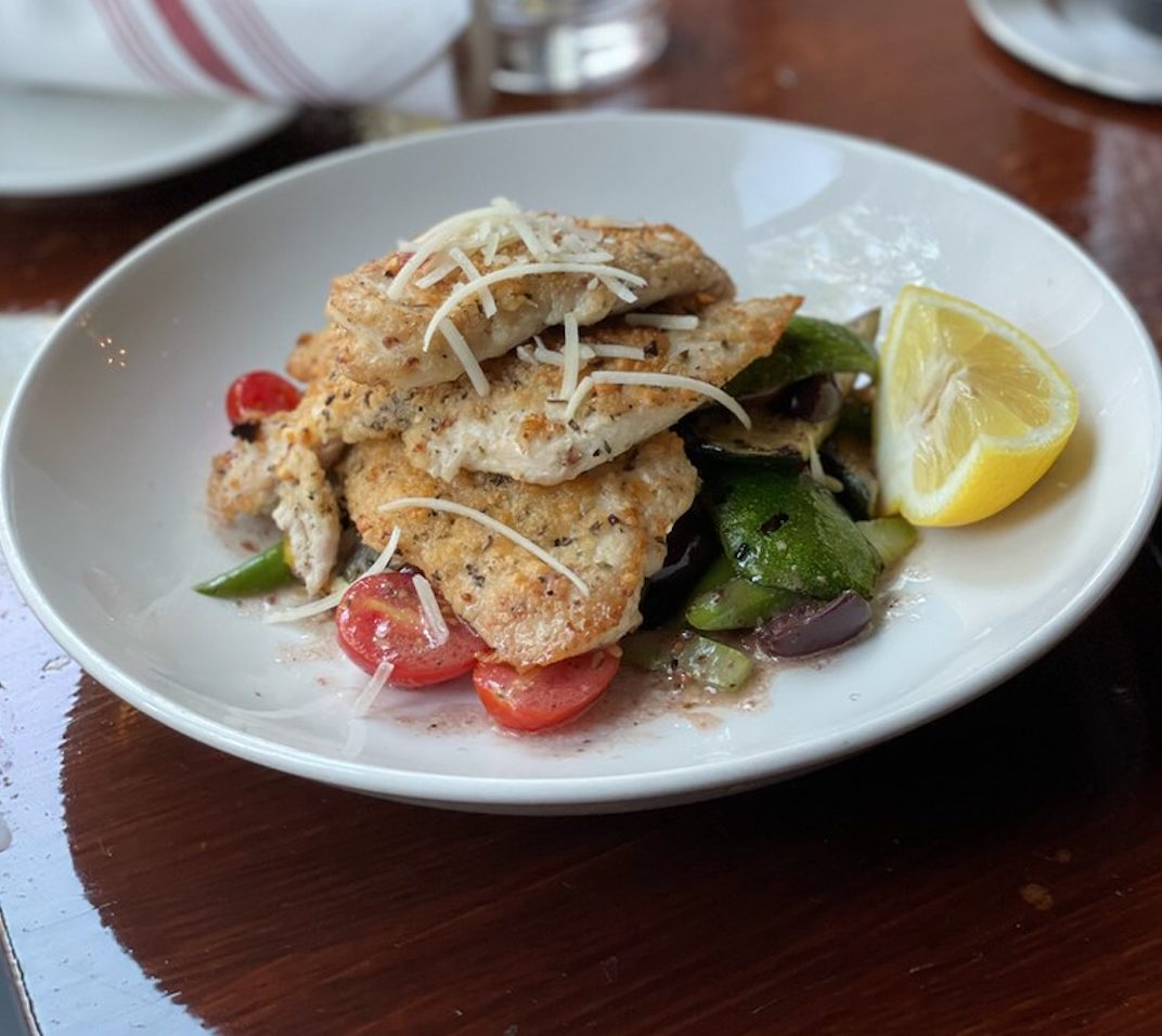 Parmesan crusted chicken breasts, roasted vegetable medley, black olive vinaigrette