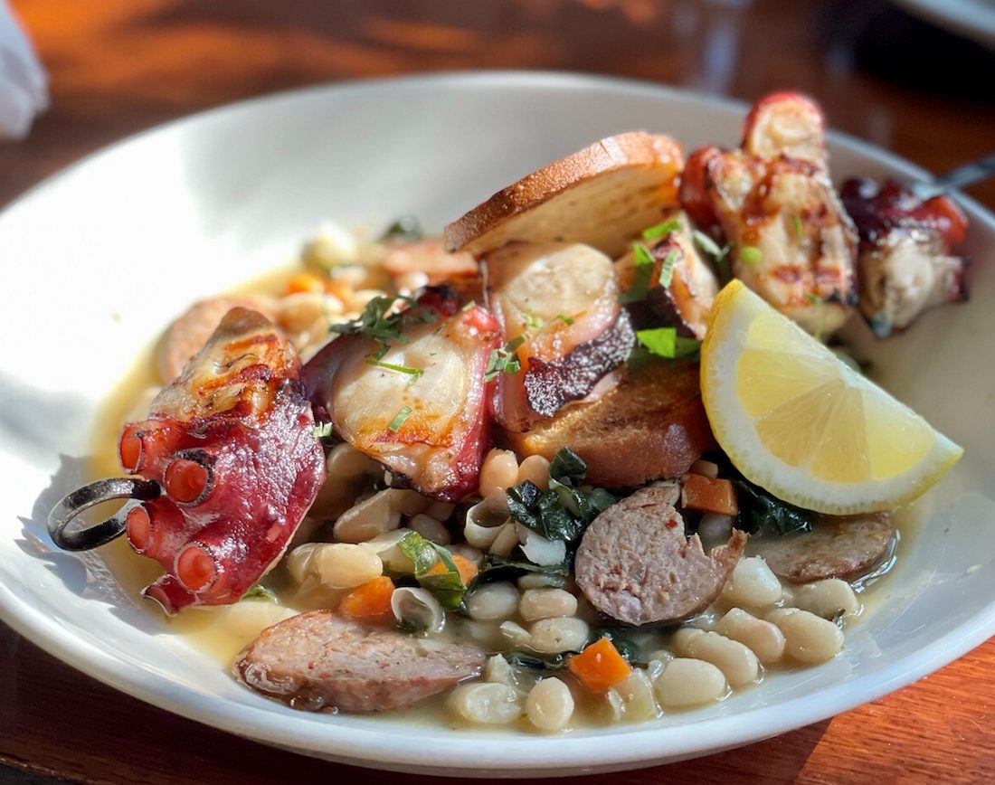 Wood grilled octopus skewer, white beans, kale, spicy Italian sausage