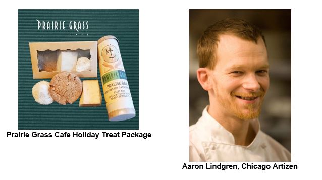 The cookies in this package are Chef Sarah's Mom's holiday cookie recipes. Prairie Grass Cafe has added in their signature chocolate praline bar from Chicago Artizen (Chefs George and Sarah know Aaron Lindgren from the Ritz Carlton days).
