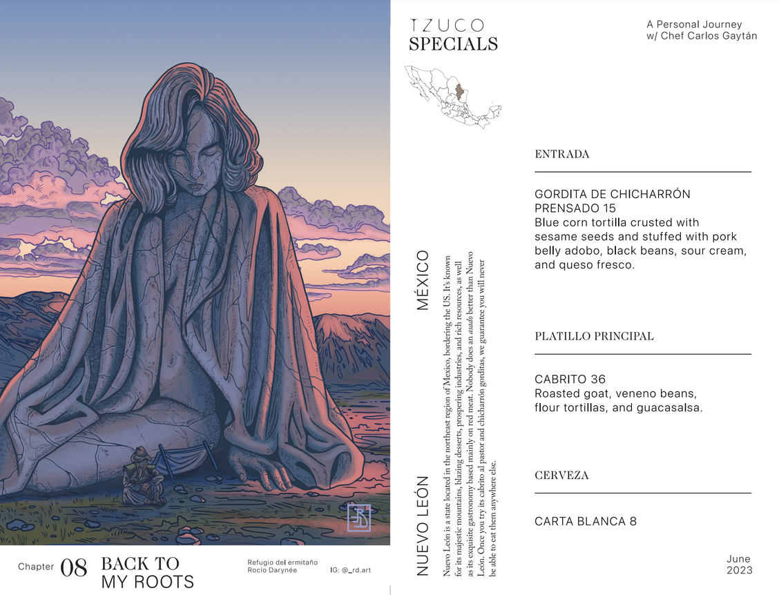 Chef Gaytán’s monthly Back to My Roots series – featuring special menu items inspired by the ingredients and gastronomy of a new region of Mexico every month. Menus are designed by an artist representing each territory, infusing visual impact and another layer of storytelling.