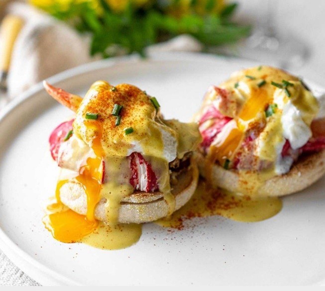 LOBSTER BENEDICT – Fresh lobster on toasted bread served with hash brown potatoes.