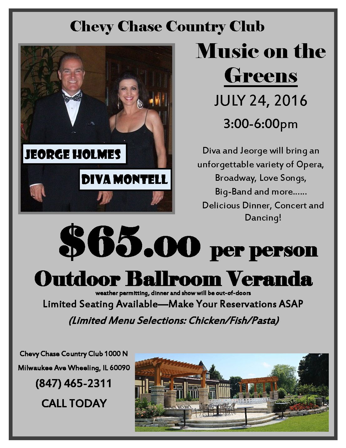 Music lovers can enjoy dinner and a variety of music from Diva and Jeorge for Chevy Chase Country Club’s Music on the Greens. The duo will bring an unforgettable variety of Opera, Broadway, Love Songs, Big-Band and more to Chevy Chase Country Club’s Grand Ballroom Patio on Sunday, July 24, 2016, 3 p.m. to 6 p.m.