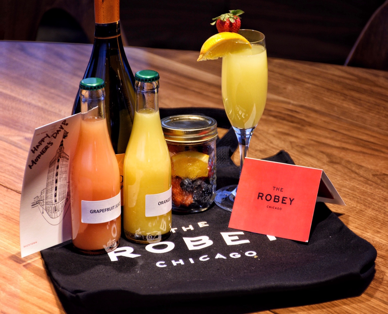 Includes: bottle of sparkling, small bottle of orange juice, small bottle of GF juice, small cup of mixed fruit, $20 Robey gift card, Robey tote bag