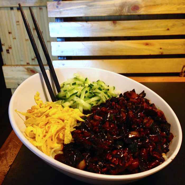 Linguine style noodles with diced zucchini and onion in a savory black bean sauce topped with chopped egg and onion. (Egg can be substituted for tofu)