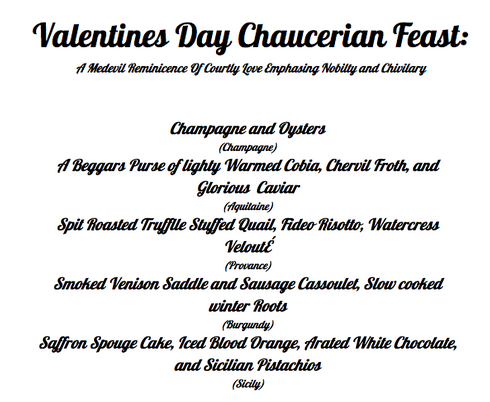 Medieval literature lists many examples of knights taking off on adventures and performing various services for ladies as a result of their courtly love.This writing emphasized the importance of nobility and chivalry. Inspired by the writings of Geoffrey Chaucer and the regions in which courtly love was once practiced,Chefs Michael Sheerin and Sarah Jordan will present their interpretations of this period's history through food.Courses will include champagne and oysters; a "beggars purse" of lightly warmed cobia, chervil froth, and caviar; and smoked venison saddle and sausage cassoulet with slow-cooked winter roots.