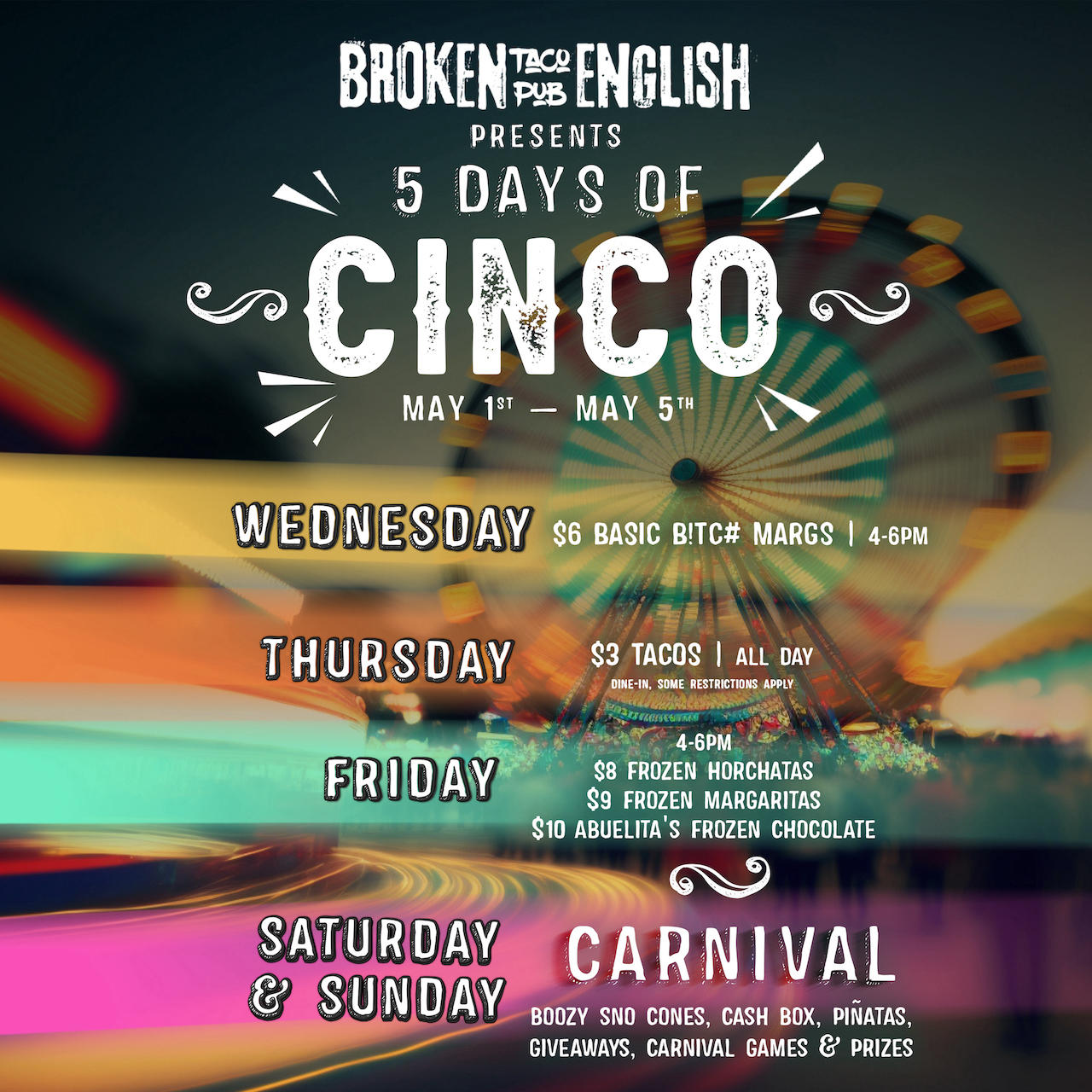 Stefani Restaurant Group will host 5 days of Cinco week at Broken English Taco Pub this year for Cinco de Mayo. On Saturday and Sunday, Broken English will be hosting Carnival at both of its locations as well.