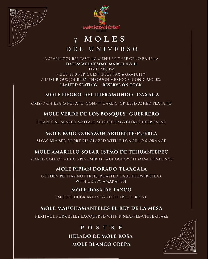 This spring, Manchamanteles will be debuting a culinary adventure: a 7-course tasting menu celebrating the world of mole from Chef Geno Bahena. From the earthy depth of traditional negro to variations that push flavor boundaries, each course is a story on its own, crafted to transport your palate.