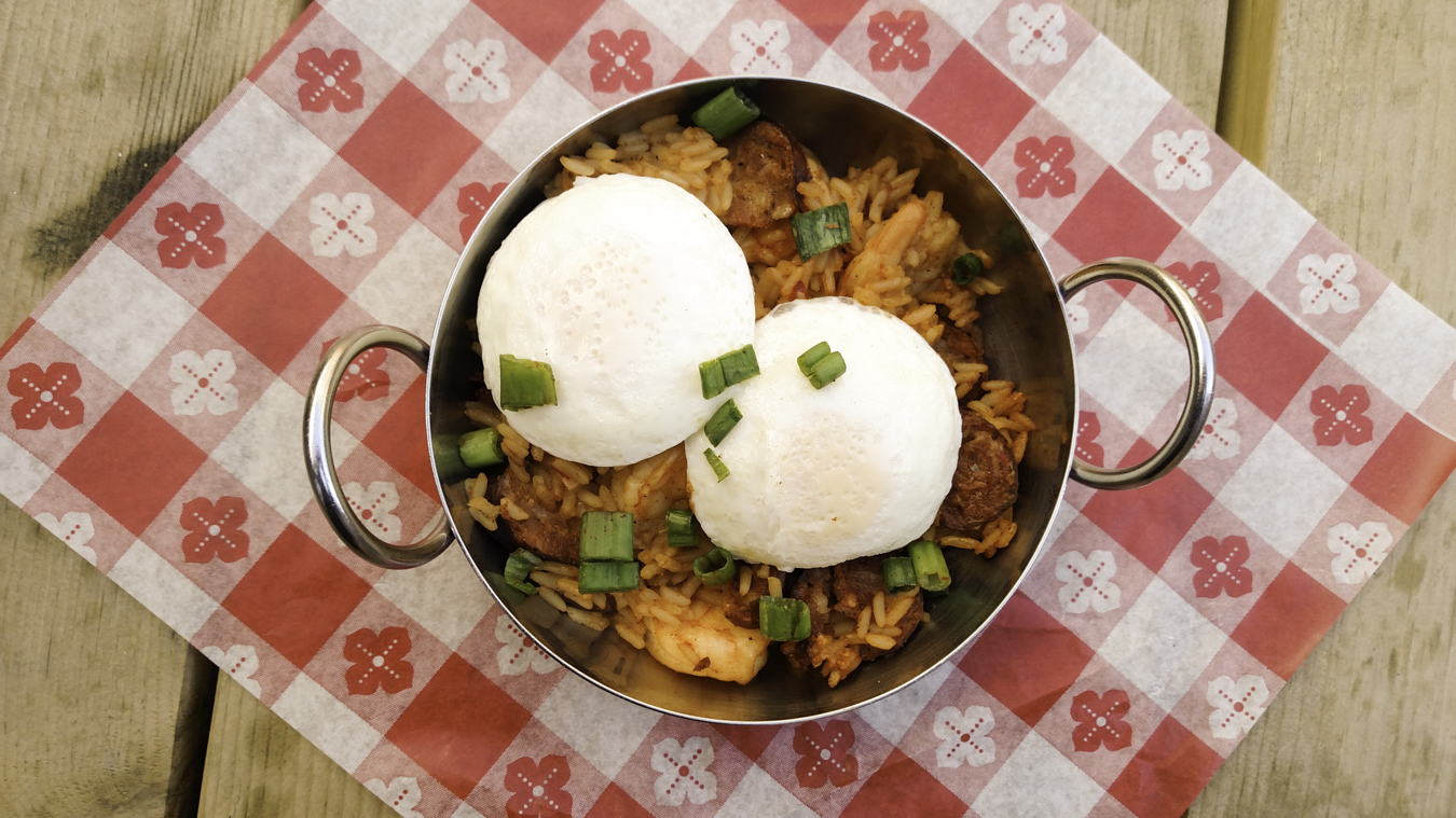 housemade sausage and shrimp jambalaya topped with cheddar cheese and poached eggs