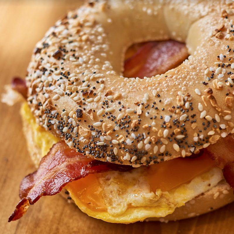 Breakfast Bagel Sandwich everything bagel with scrambled egg, cheddar cheese and choice of ham, bacon or sausage served with tots and fruit $13