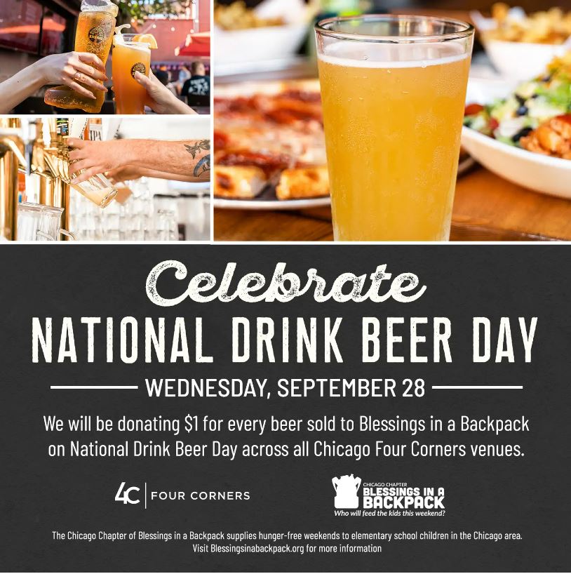 For every beer sold on National Drink a Beer Day (September 28th), Four Corners will donate $1 to Blessings in a Backpack. The Chicago Chapter of Blessings in a Backpack supplies hunger-free weekends to elementary school children in the Chicago area. You can find each concept participating in this opportunity below.