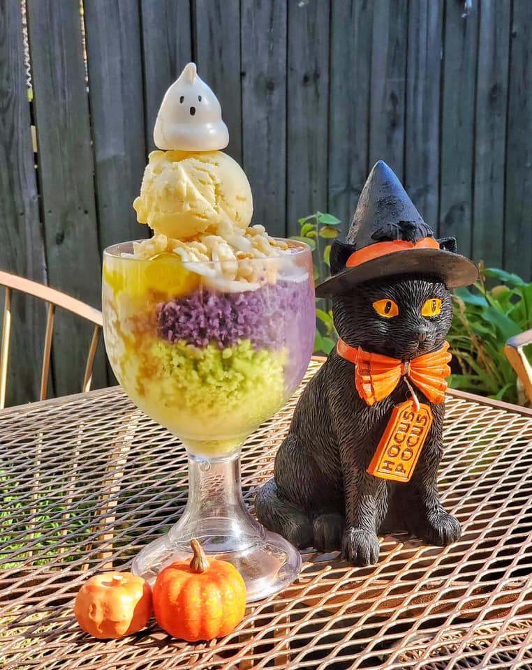 The Halo-Halloween dessert is available the entire month of October. A spooky take on the Filipino restaurant’s signature Halo Halo Dessert, the Halo-Halloween is a cold, layered dessert of shaved ice and condensed milk, ube jam, Kaong, Nata de Cocoa, rice crispies & housemade ice cream.
