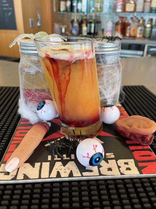 Three types of rum – white, dark, and spiced – with pineapple juice, orange juice, grenadine, dried cranberry “brains,” sugar eyeballs, and passion fruit “blood