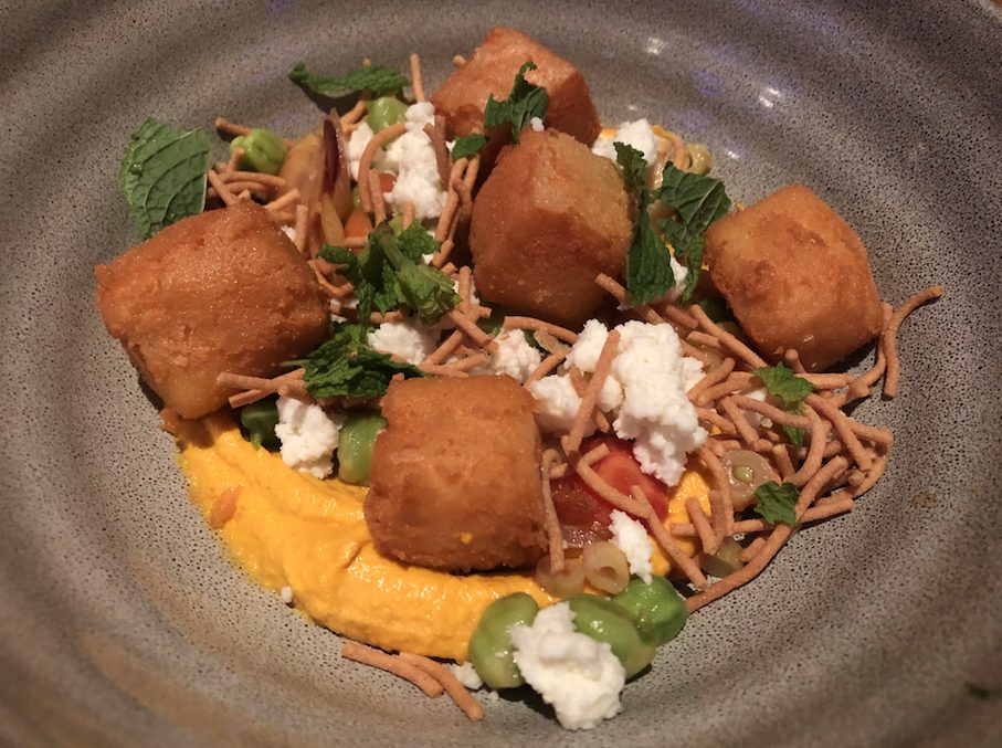 One of the many dishes served at the event: Chickpea Fritter with carrot hummus, spring veggies, sheep's milk feta and sev.