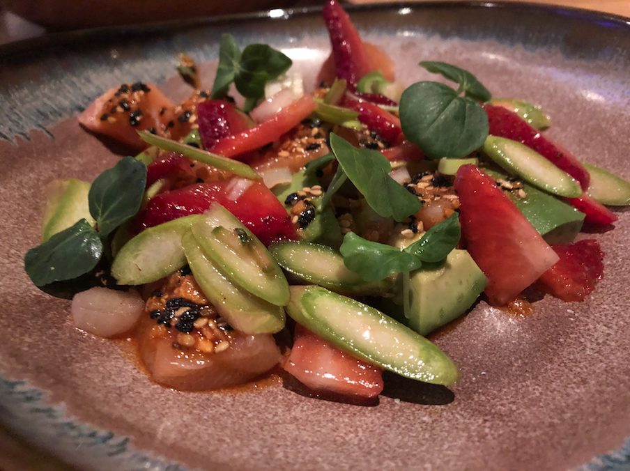 One of the first course dishes: Skuna Bay Salmon with chili crunch, strawberry, avocado and asparagus