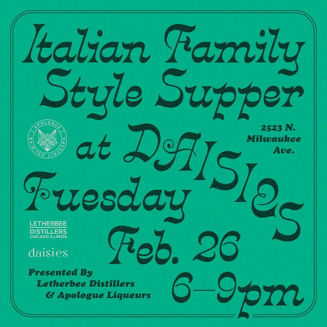 On Tuesday, February 26th, Daisies (2523 N Milwaukee Avenue) is going classic Italian with a little help from its friends at Letherbee Distillery and Apologue Liqueurs. Their Italian Family-Style Feast, will feature the below menu of Italian pastas paired with riffs on classic Italian cocktails, highlighting local spirits from Letherbee and Apologue. The dinner is set to start at 6:30PM and is $75 including the cocktail pairings. Tickets can be purchased here.