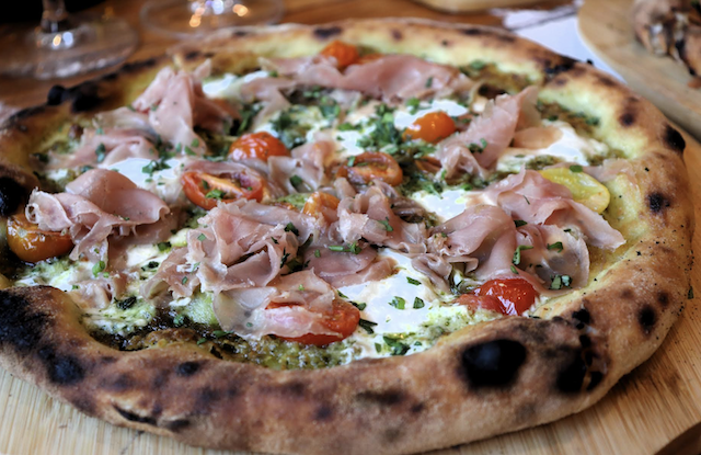 Burrata, prosciutto, tomato medley, pesto