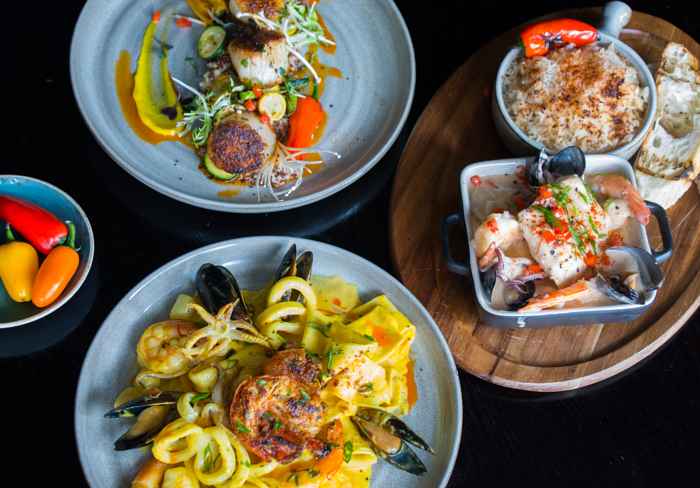 Moqueca Brazilian Fish Stew with coconut rice Seafood Pasta with creamy saffron sauce El Dorado - Mahi Mahi papillote banana leaves, saffron rice, ají-amarillo sauce, mango relish Seared scallops with quinoa, grilled veggies, ahi-panca sauce