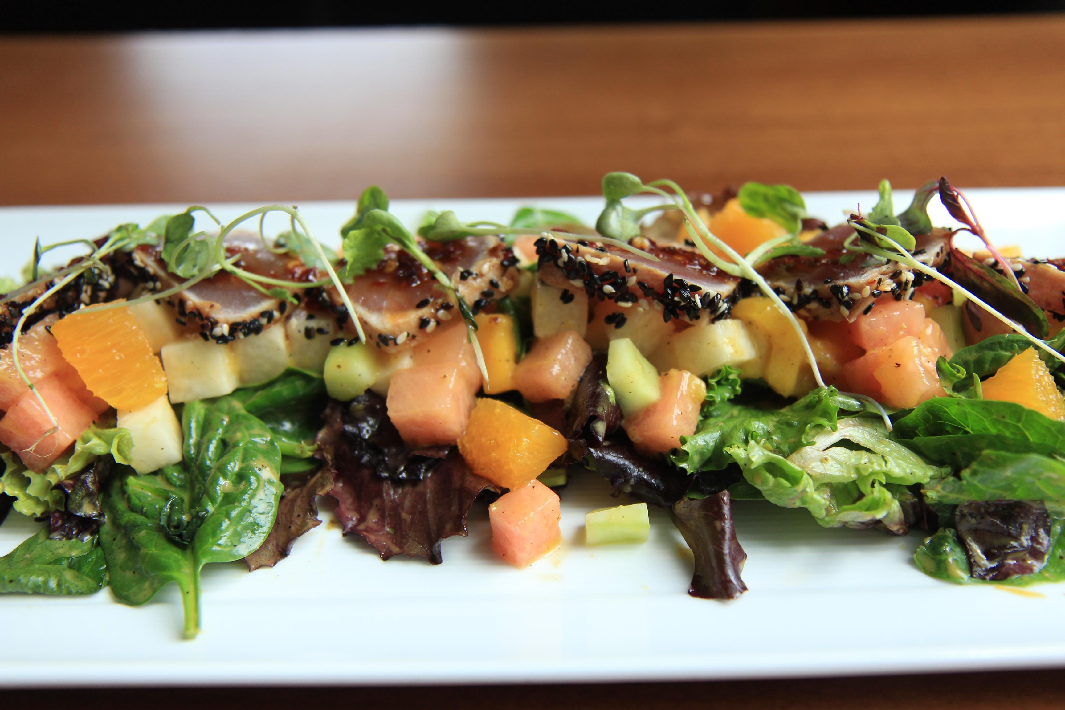 Another light fish option is the más Tuna Salad, made with seared ahi tuna, mixed greens, fresh chopped mix, spicy orange vinaigrette, and microgreens.