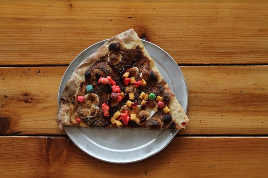 Veggie slice - Peanut butter, lite ricotta, chocolate bars, marshmallows, Captain Crunch, graham crackers and pink popcorn, with a grape jelly drizzle.