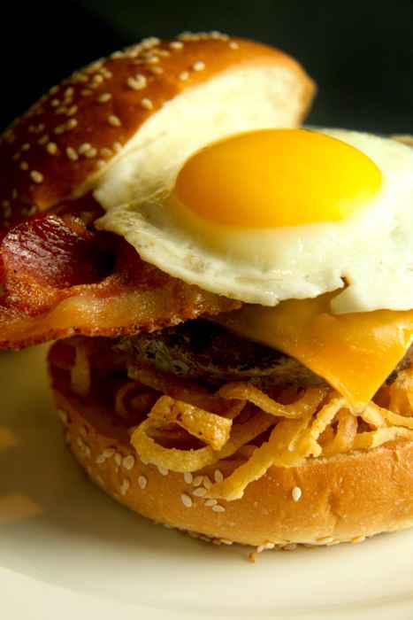 Sunrise Burger - cheddar, crispy bacon, sunny side up egg, french fries and tabasco $14