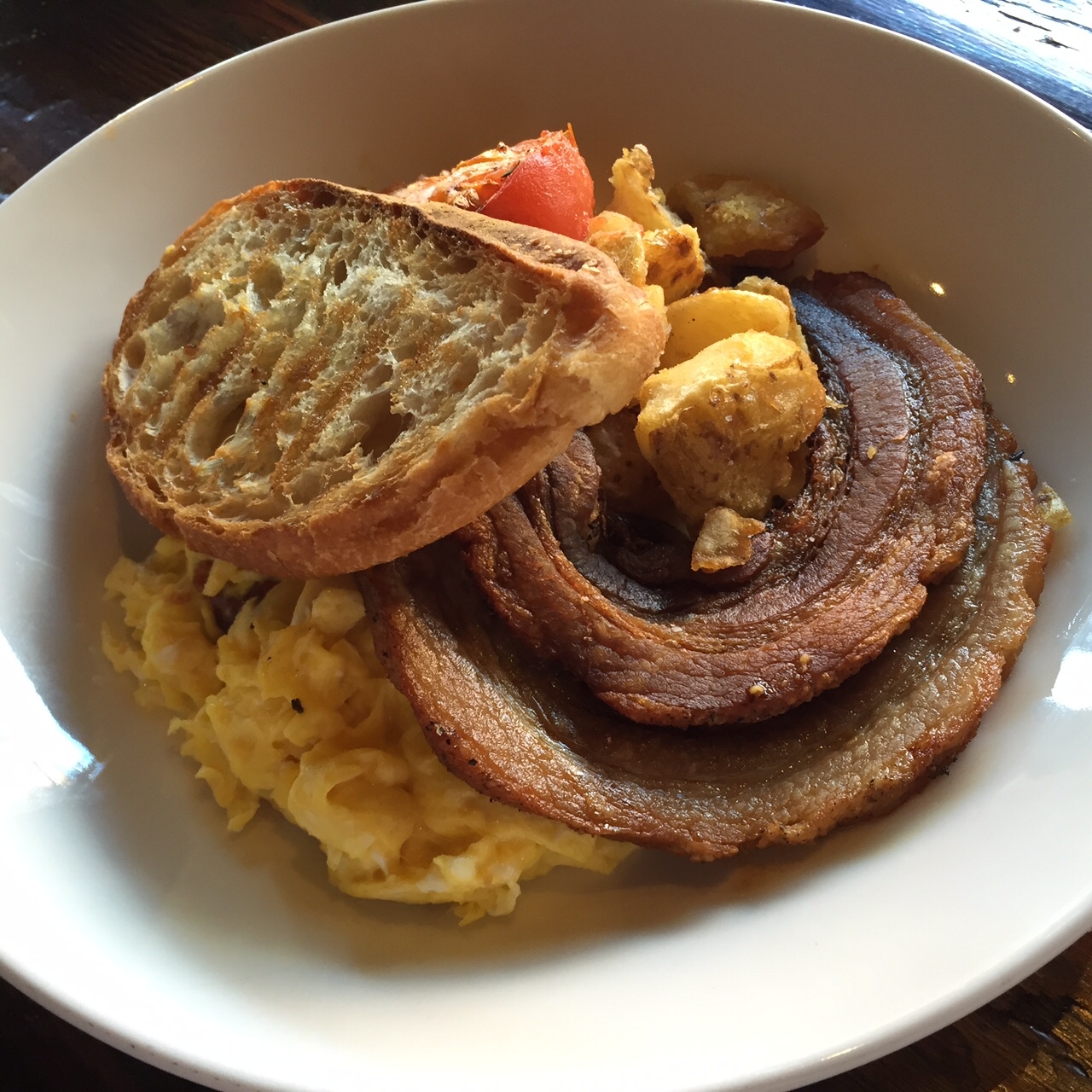 Crispy Pork Belly – roasted tomatoes, melted mozzarella, scrambled eggs, and crispy potatoes $13