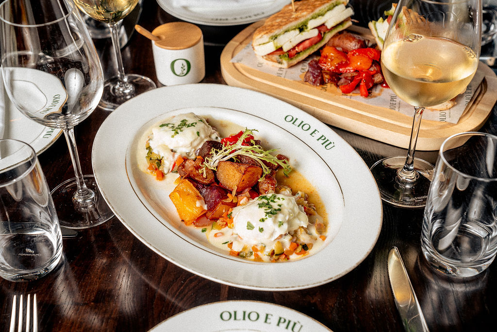 Olio e Più will offer Easter menu features alongside its brunch service. Dishes include crispy artichokes with ricotta and mint pesto, paccheri with seafood, and chocolate rice pudding. Brunch menu items include French toast with berries and mascarpone, poached eggs with potatoes and prosciutto, avocado toast with eggs and vegetables, eggs with ratatouille and cheese, and eggs Benedict on focaccia. A beverage offering will include mimosas with multiple juice options and additional sparkling wine selections.