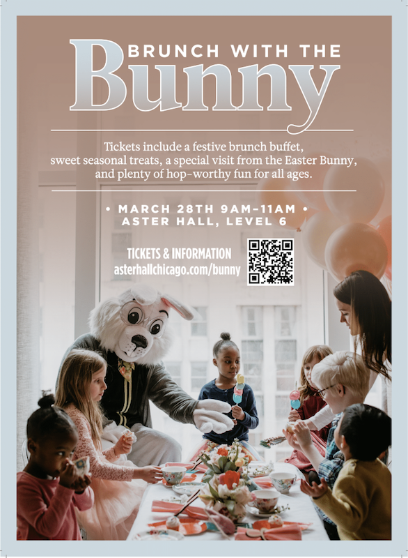 Brunch with the Bunny takes over Aster Hall: Bar & Study on March 28 from 9 to 11 AM, pairing a buffet-style brunch and kids’ activities with a meet and greet with the Easter Bunny, all set against skyline views of Michigan Avenue and Lake Michigan. It’s an all-in-one alternative to the typical Bunny photo stop, with handcrafted cocktails for parents and a festive indoor setting. Get your tickets via Eventbrite.