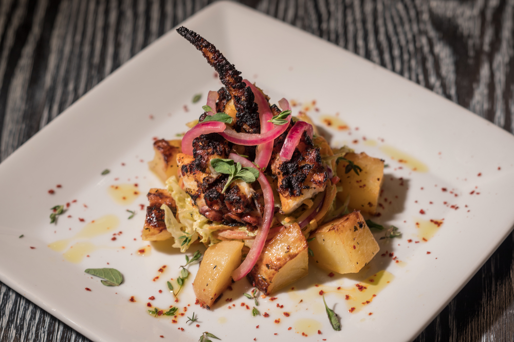 BBQ Octopus with charred lemon garlic potatoes, ranch cabbage slaw and pickled shallots ($19.95)