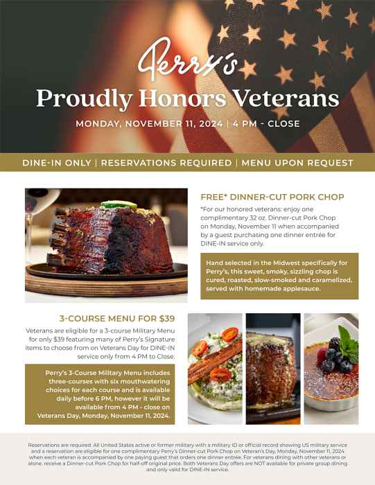 On Monday, November 11, veterans dining at Perry’s from 4 p.m. to close can receive a complimentary 32-ounce dinner-cut pork chop when joined by a guest purchasing an entrée. Veterans dining alone or with other veterans receive the dinner-cut pork chop at half price, with an additional 3-course Military Menu available for $39.
