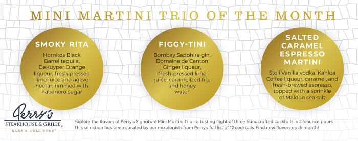 In November, Perry’s introduces a Mini Martini Trio featuring the Smoky Rita, Figgy-Tini, and Salted Caramel Espresso Martini.