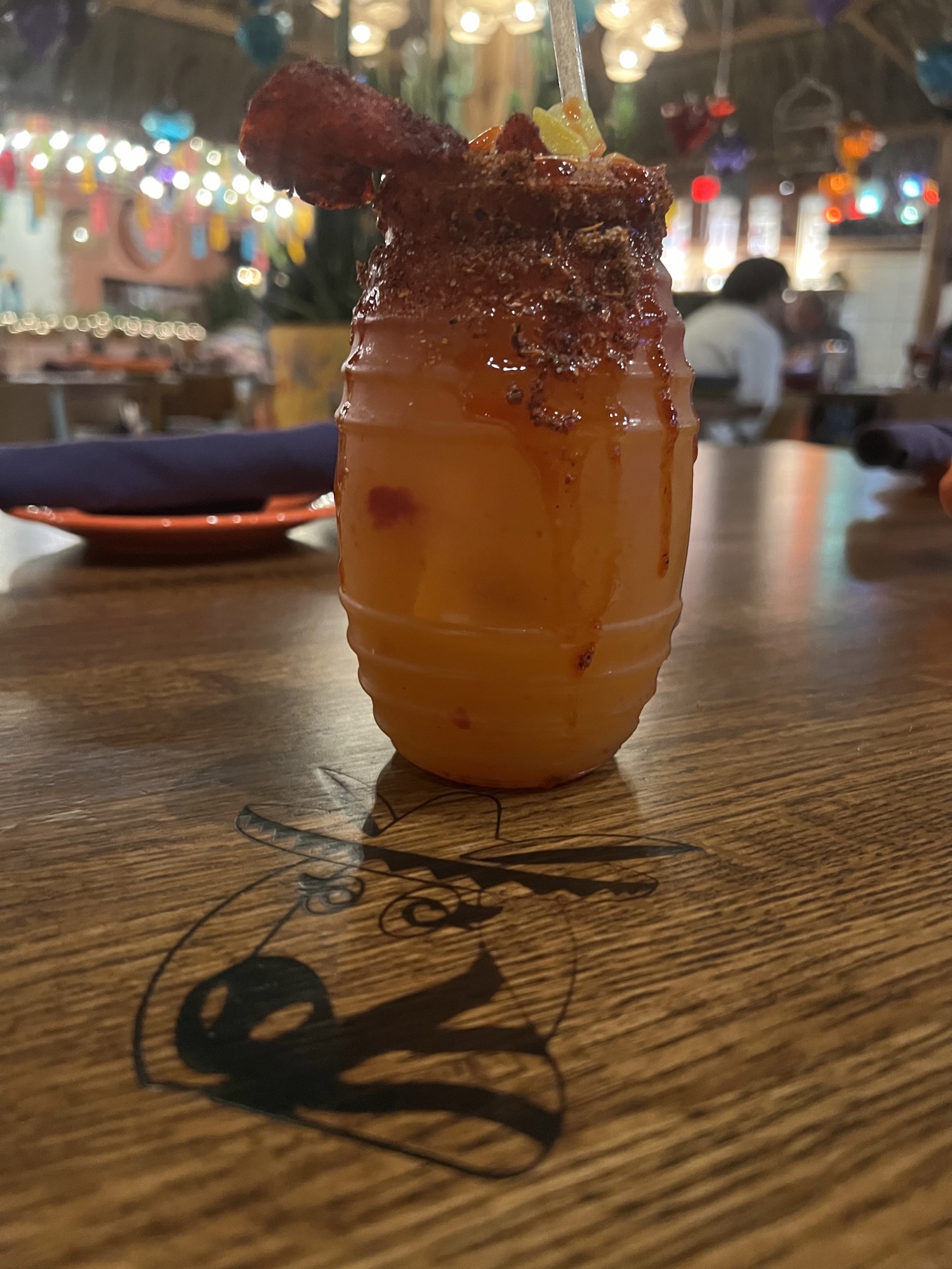 Tequila is mixed with a juicy prickly pear puree and combined with agave. Served with a citrus salt rim and a lime.