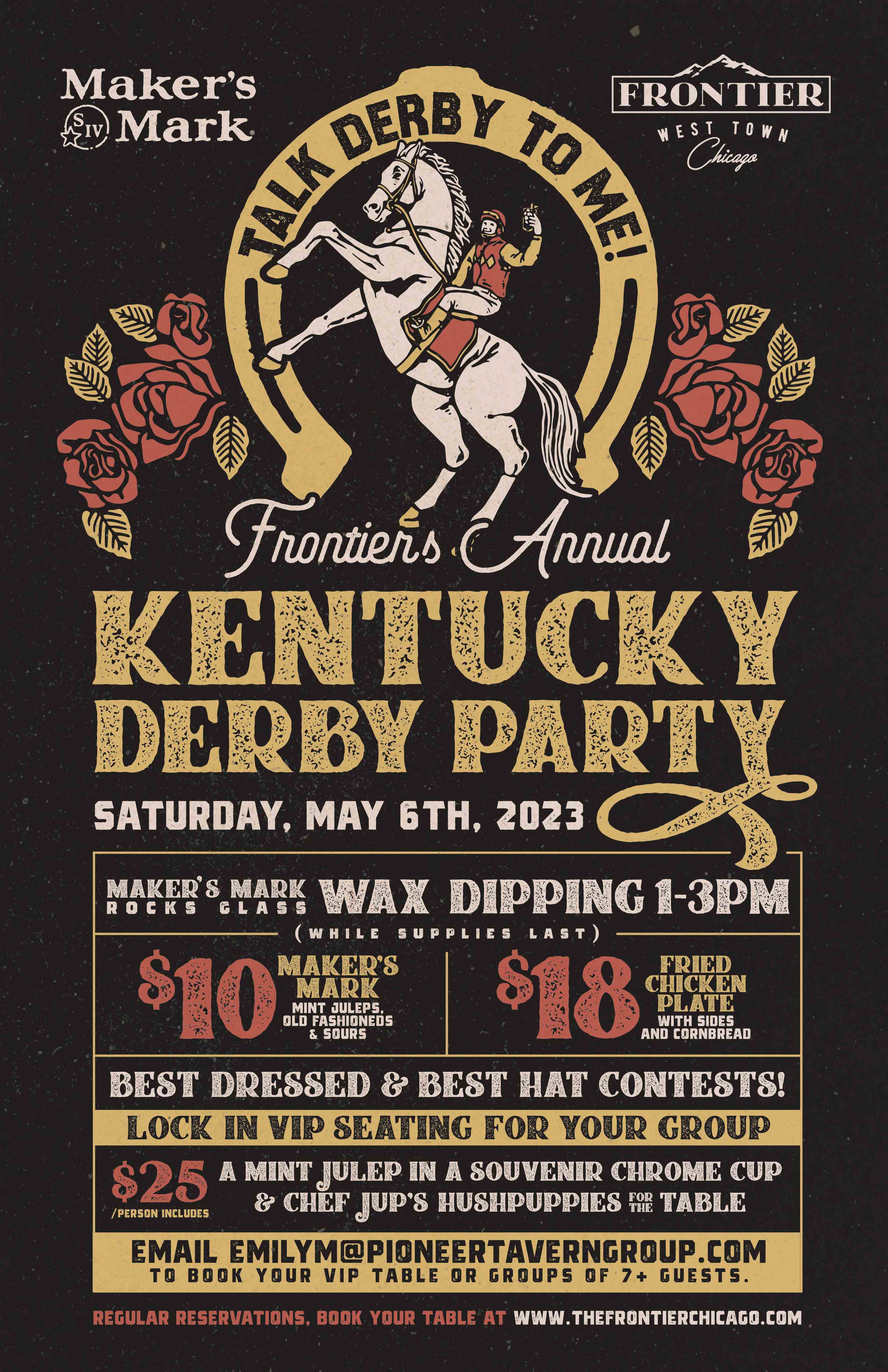 Frontier’s (1072 N. Milwaukee Ave) Annual Kentucky Derby Party is back. $10 Maker’s Mark (mint juleps, old fashioneds, & sours) will be offered with $18 fried chicken plates (served with sides & cornbread).
