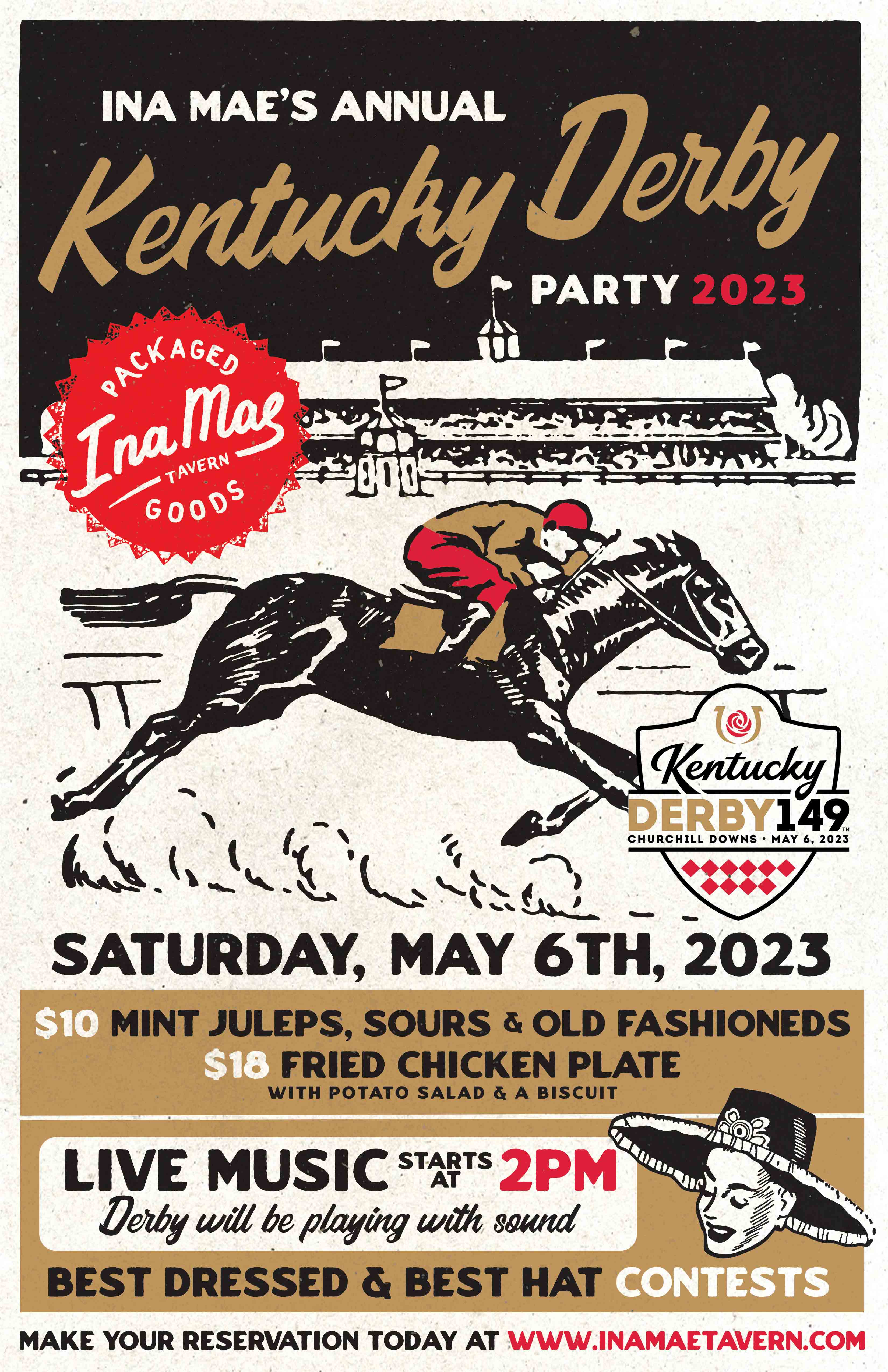 Ina Mae Tavern (1415 N. Wood St) on Saturday, May 6th is hosting their annual Kentucky Derby Party. With live music starting at 2 PM, guests can order food and drink specials while watching the derby. Offerings include $10 mint juleps, $10 sours and old fashioneds, and $18 fried chicken plates (served with potato salad and a biscuit). Best dressed and best hat contests will be held.