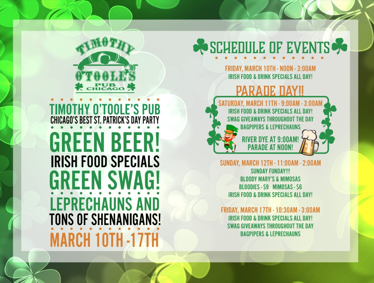 Timothy O’Toole’s will hold their 31st annual St. Patrick's Day celebration in Streeterville this March! The green beer will be flowing early, as the Irish Pub will open at 9 a.m. on Parade Day (Saturday, March 11) and at 10:30 a.m. on St. Patrick's Day (Friday, March 17). St. Paddy's partygoers will be provided performances by the Shannon Rovers Bagpipers, entertainment by Joe the Leprechaun, and prizes, swag and giveaways until 3 a.m. on both days.