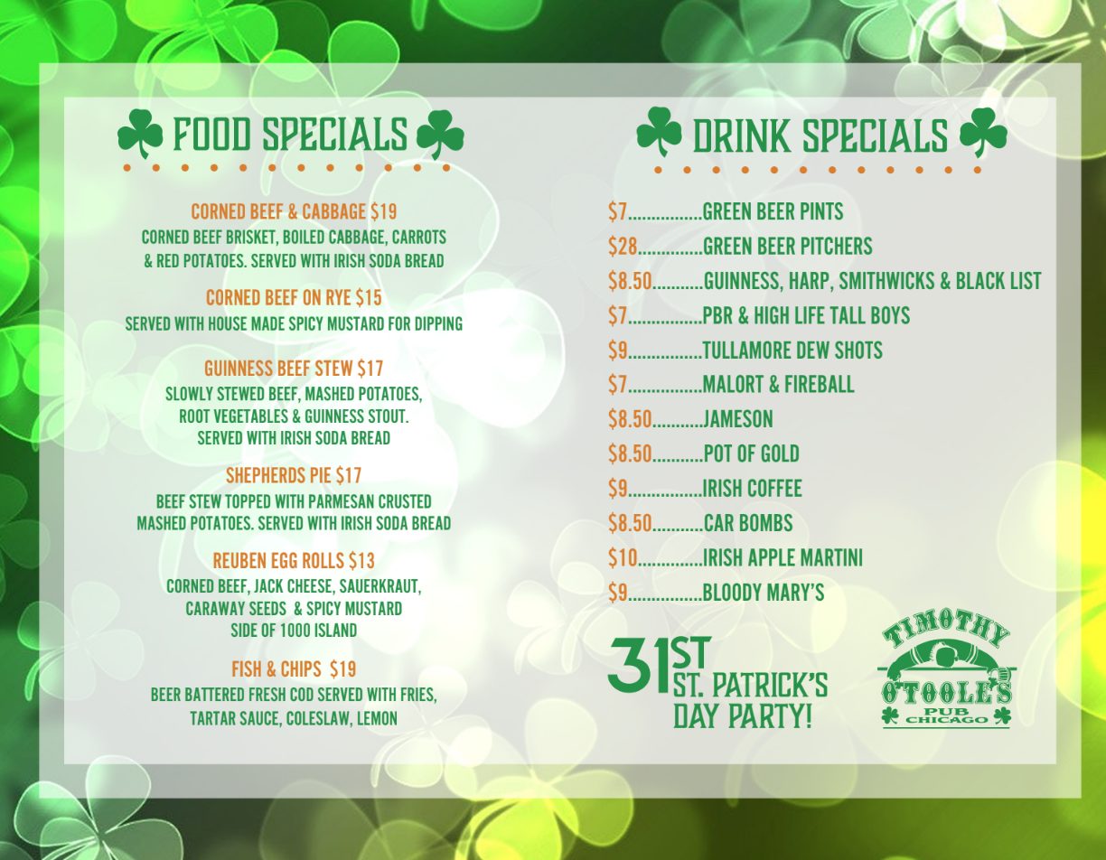 From March 10-17, O'Toole's will offer St. Patrick's Day drink specials and Irish-inspired dishes, including corned beef and cabbage, corned beef on rye, Guinness beef stew, Shepherd's pie, and more.