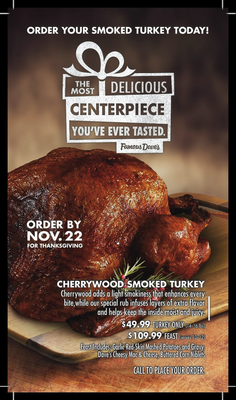 Stop by Famous Dave's for a special Thanksgiving feast! The main dish is turkey, of course, and the sides include potatoes, corn, green beans, and Mac and Cheese. This delicious feast can serve up to 12 people, so bring your friends and family!