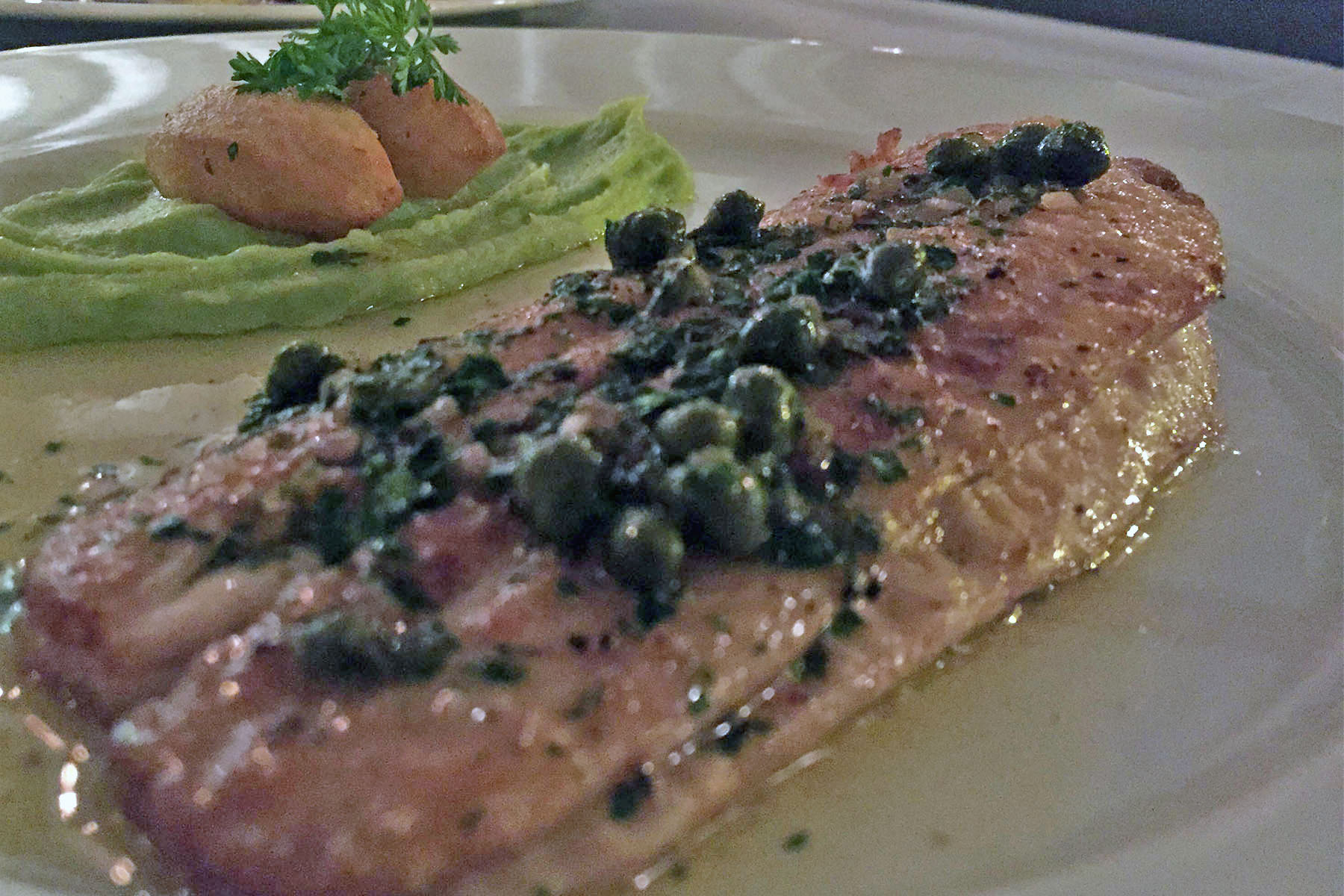 topped with capers, the fish is plated with roasted potatoes and watercress-pomme