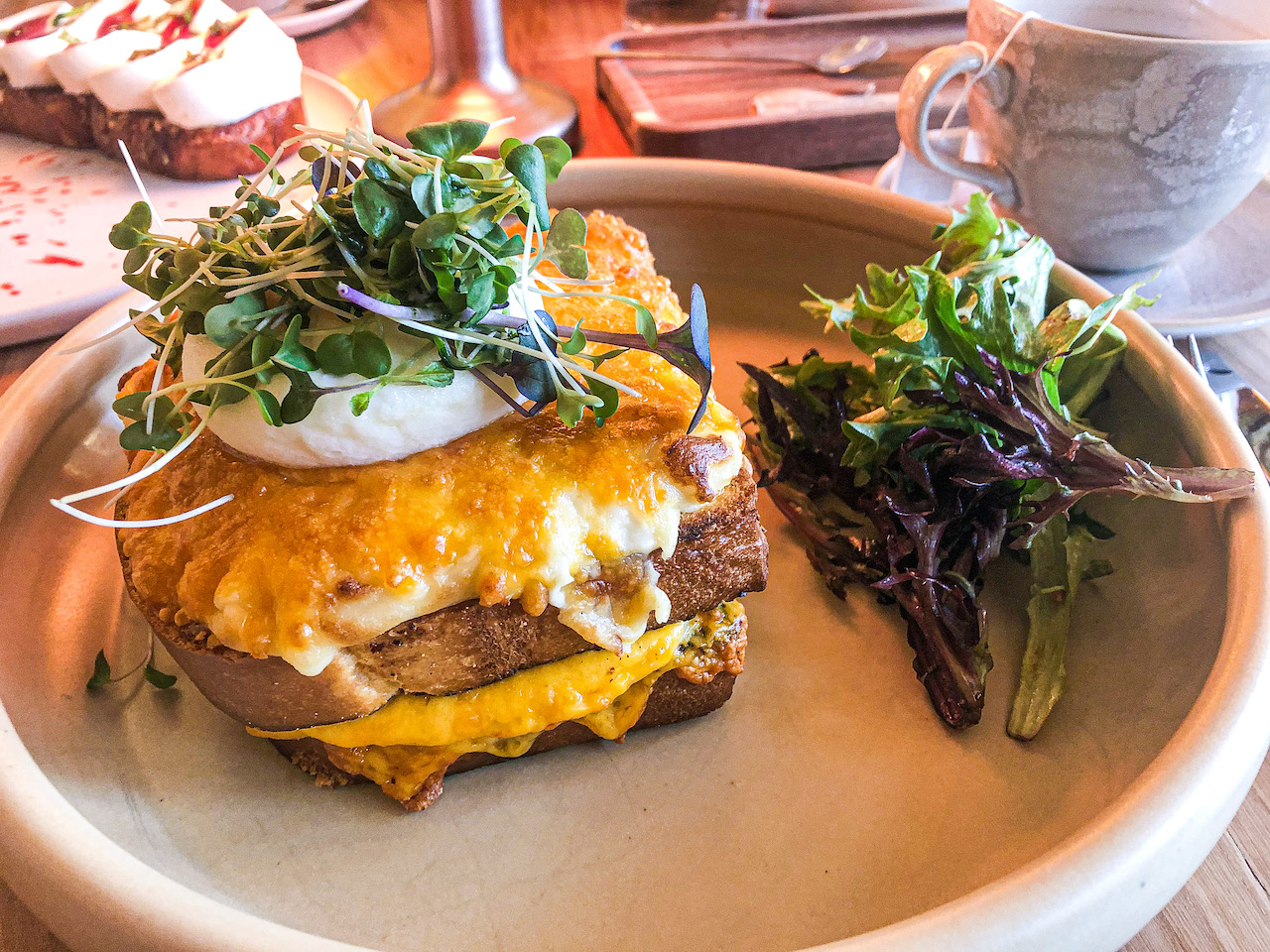 Blurring the lines between a luxe breakfast item and a lunchtime sandwich, the Croque Madame will give you the creamy and salty profiles you desire at brunch. Hefty slices of Texas Toast and turkey get lost under a blanket of melted cheddar cheese and velvety mornay sauce. Adding a breakfast-y element, is a tiny but perfectly poached egg resting on top of it all. Although it looks like a handheld, this dish requires a fork and knife to eat!